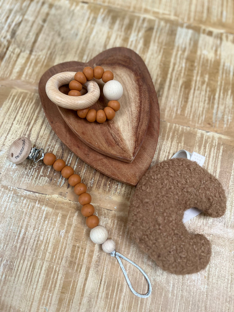 ✨ This set contains a fluffy Brown moon a teether and a pacifier holder with Brown beams